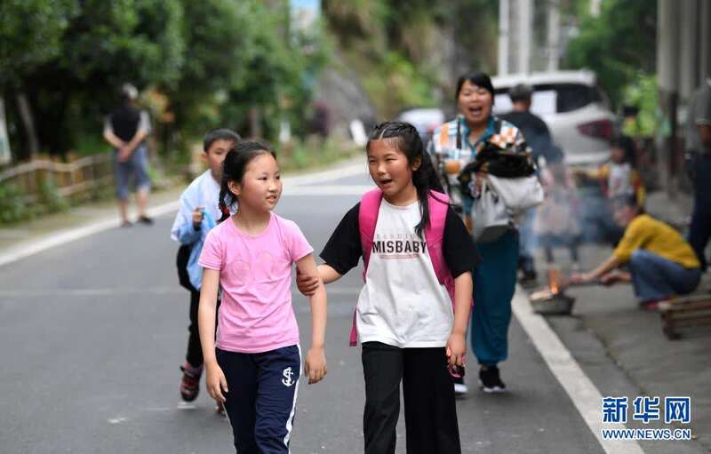 5月27日,张清语(右)放学后和同学一起步行。新华社记者杜宇摄