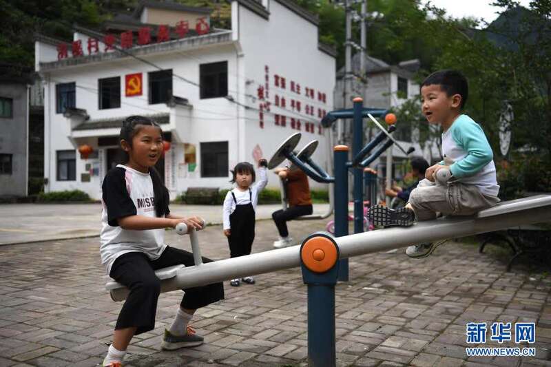 5月27日,张清语在清溪村卫生室门前的广场上与小朋友玩耍。新华社记者刘军喜摄