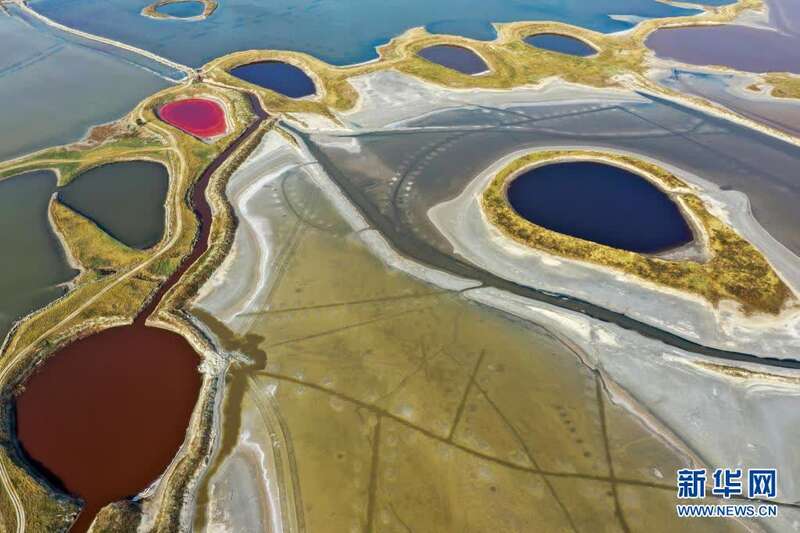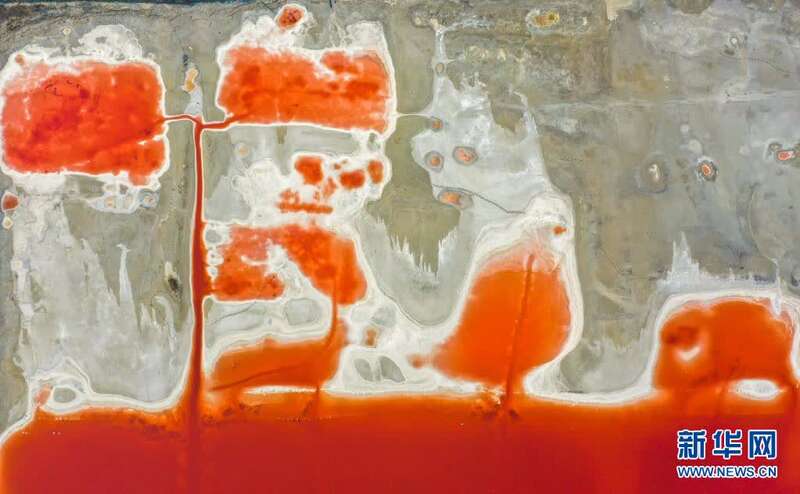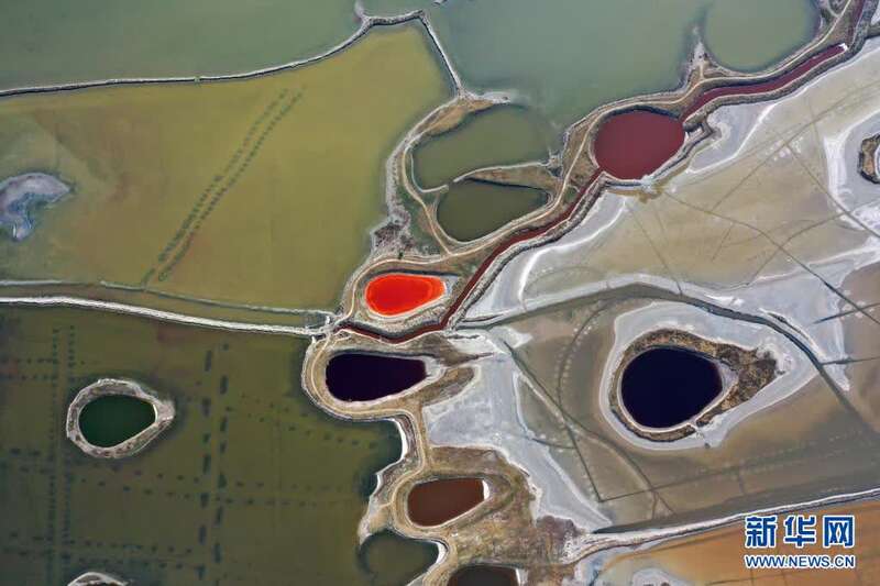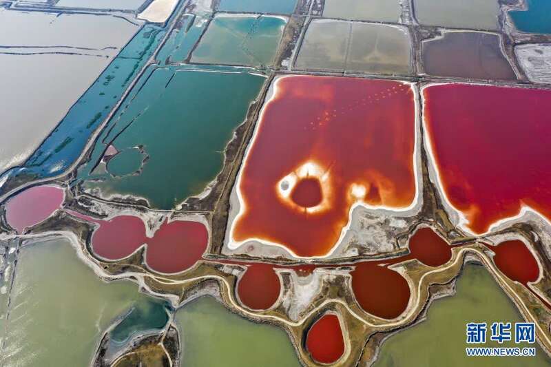 近日,随着气温不断升高,山西运城盐湖呈现五彩斑斓的景象。