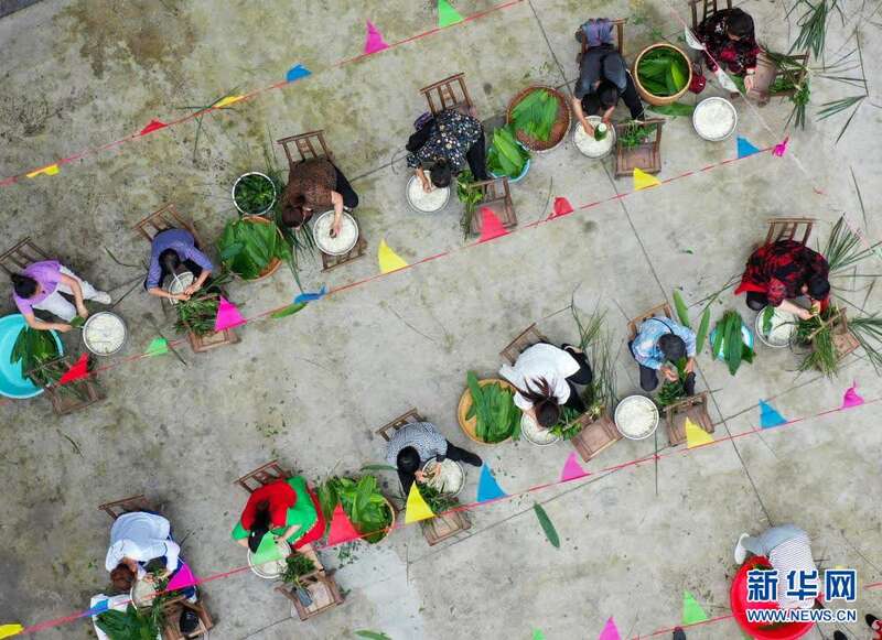 6月2日,贵州省铜仁市玉屏侗族自治县亚鱼乡郭家湾村村民参加包粽子比赛(无人机照片)。新华社发(胡攀学摄)