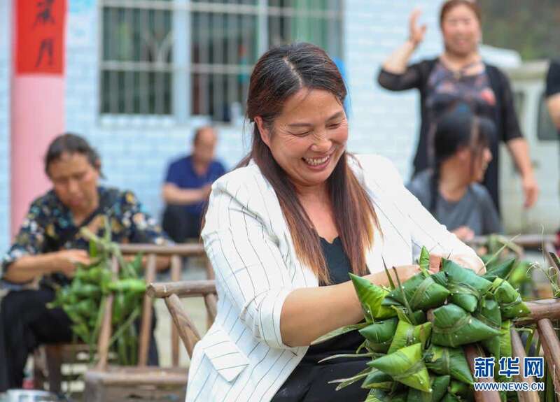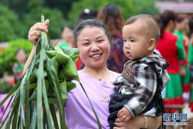 6月2日,贵州省铜仁市玉屏侗族自治县亚鱼乡郭家湾村村民展示自己包的粽子。新华社发(胡攀学摄)