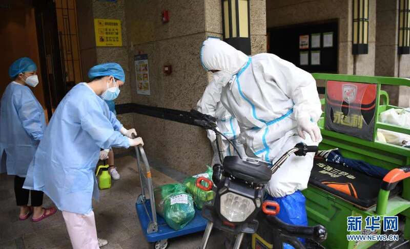 6月2日,在广州荔湾区白鹤洞街道一小区,物业人员将业主网购的物品运送至楼栋门口,再由配送志愿者送至各住户门口。新华社记者邓华摄