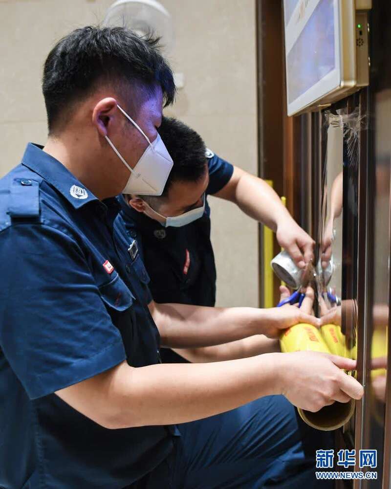 6月2日,在广州荔湾区白鹤洞街道一小区,物业人员在更换电梯口按键覆盖薄膜。新华社记者邓华摄