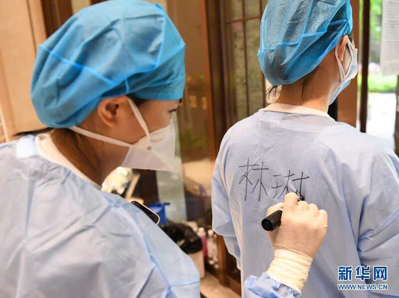 6月2日,在广州荔湾区白鹤洞街道一小区楼栋大堂,配送志愿者帮助另一位志愿者在后背写上名字。新华社记者邓华摄