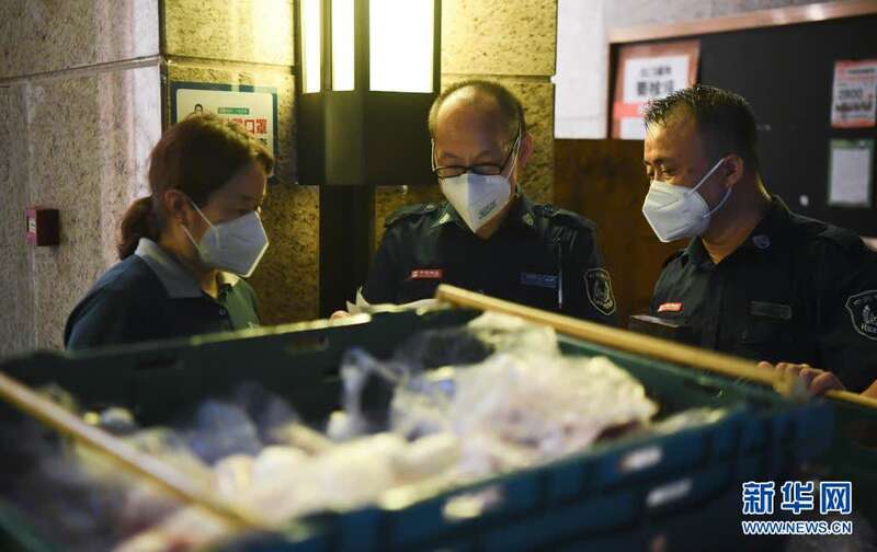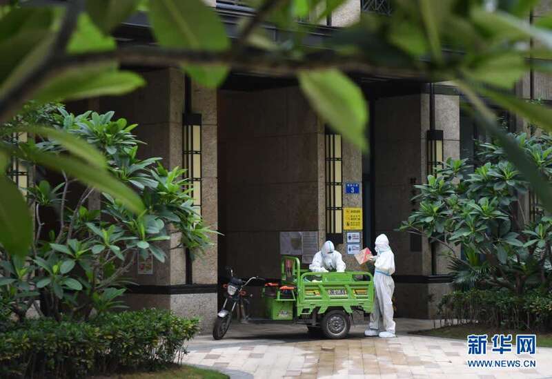 在封闭式管理范围内的荔湾区白鹤洞街道某小区,为保障生活必需品供应,业主们组织了志愿服务队。网购物品由物业人员统一送到楼栋大堂后,由业主志愿者配送至各住户门口。目前小区内秩序井然。