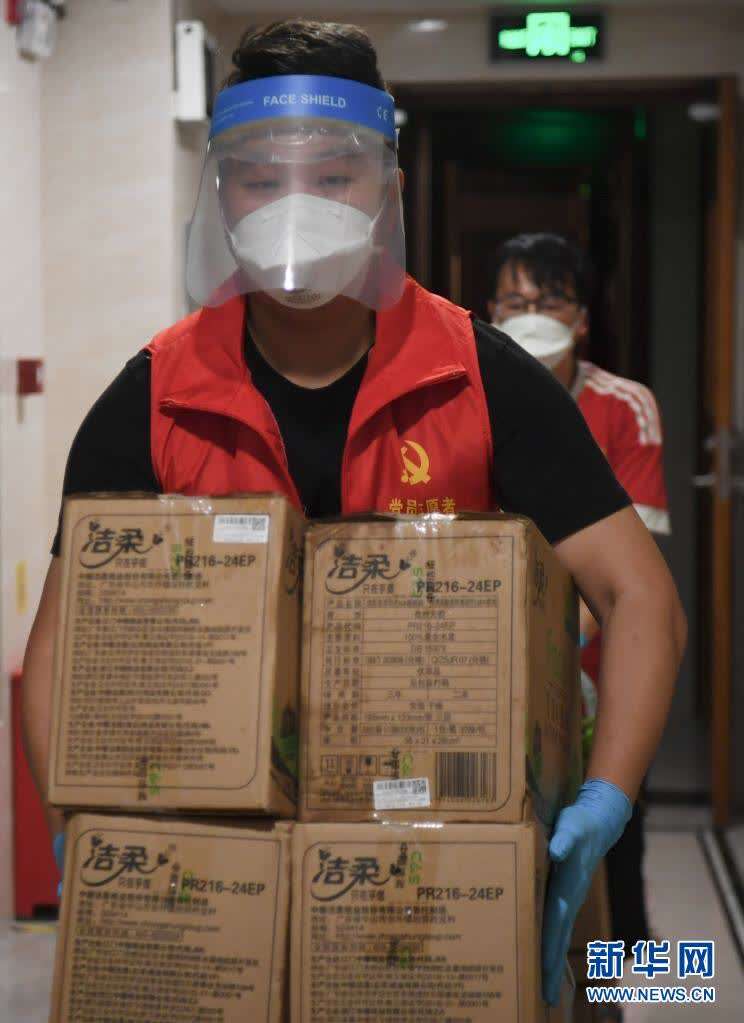 6月1日,在广州荔湾区白鹤洞街道一小区,一位配送志愿者搬运网购物品。新华社记者邓华摄