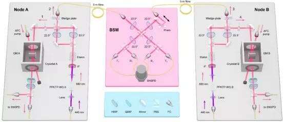 经过多年攻关,科研团队成功使用吸收型量子存储器演示了量子中继的基本链路。一个基本链路由两个分离的量子节点,以及中间站点贝尔态测量装置组成。每个量子节点中除了“牛郎”“织女”量子存储器之外,还各有一个纠缠光子对。实验中,每个纠缠光子对中的一个光子被量子存储器捕获并存储,每个纠缠光子对的另一个光子通过光纤同时传输至中间站点“鹊桥”进行贝尔态测量,测量的过程就是纠缠建立的过程。