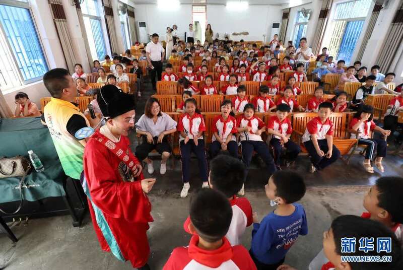 6月3日,演员在资兴市鲤鱼江完全小学为学生表演花鼓戏。新华社发(李科 摄)