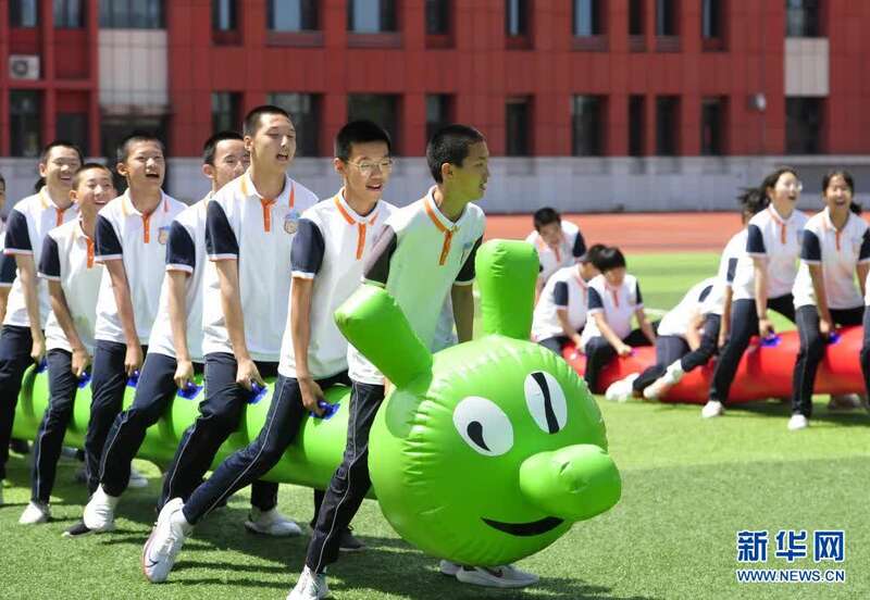 6月3日,沧州市第十七中学的学生在体育课上进行“奋勇前进”运动项目比赛。新华社发(苑立伟 摄)