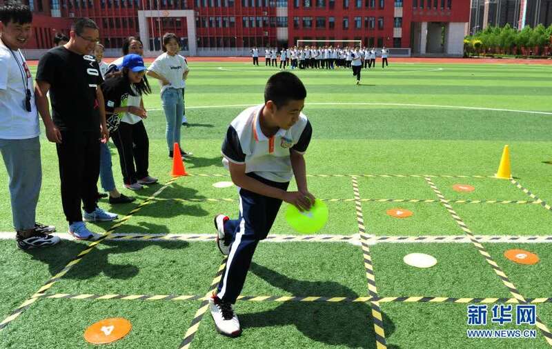 6月3日,沧州市第十七中学的学生在体育课上参加“智力九宫格”运动项目。新华社发(苑立伟 摄)