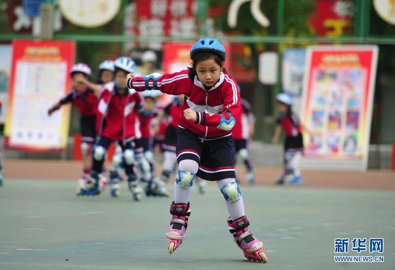 6月3日,沧州市育红小学的学生在体育课上练习轮滑。新华社发(苑立伟 摄)