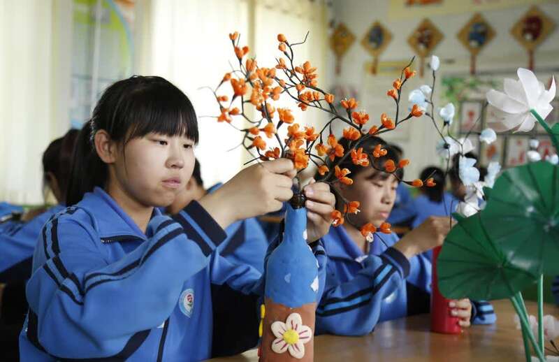 6月3日,河北省邢台市晏家屯中学学生利用废旧物品做装饰品。新华社发(张驰 摄)