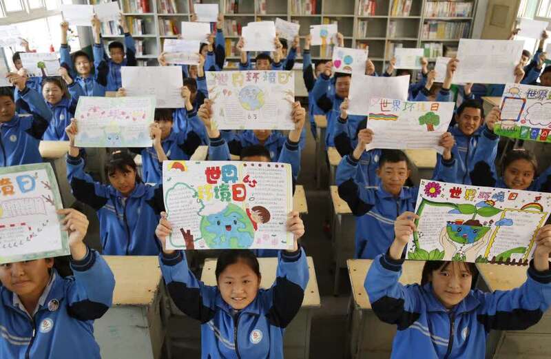 6月3日,河北省邢台市晏家屯中学学生展示环境保护手抄报。新华社发(张驰 摄)