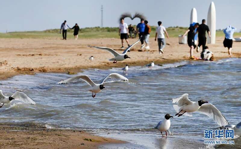 6月2日,游人在红碱淖景区游玩,遗鸥在一旁相伴。新华社记者 陶明 摄