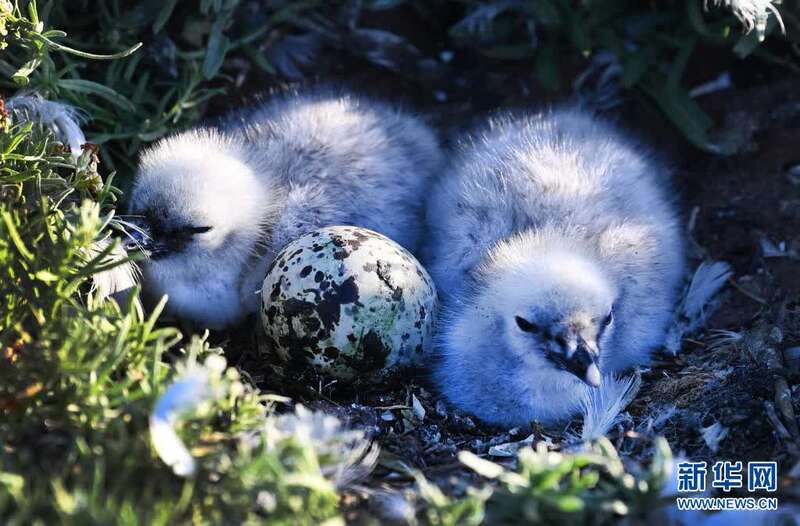 一对小遗鸥在红碱淖鸟岛上出世(6月3日摄)。新华社记者 陶明 摄