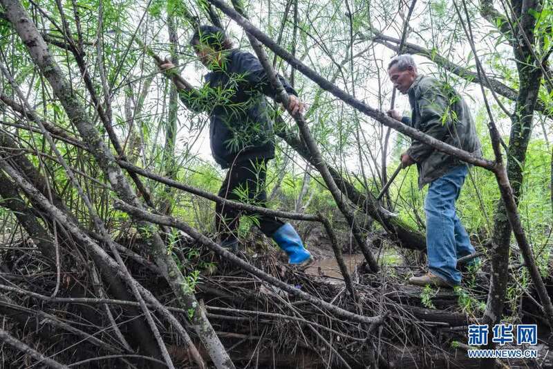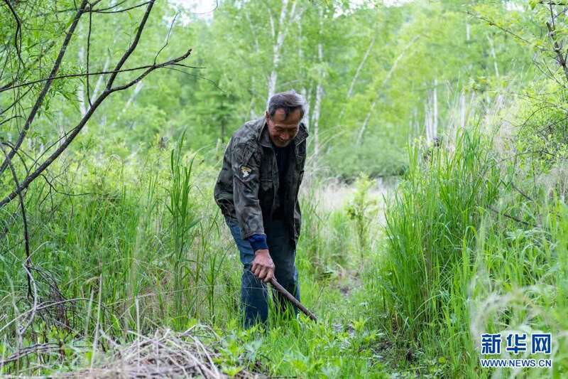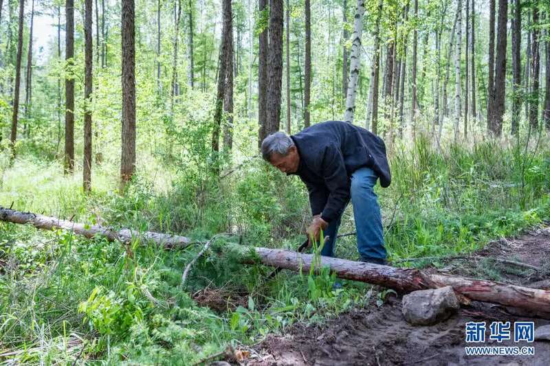 6月3日,在黑龙江省伊春市乌马河林业局有限公司乌马河林场分公司施业区,张英善在巡山时平整道路。新华社记者 谢剑飞 摄