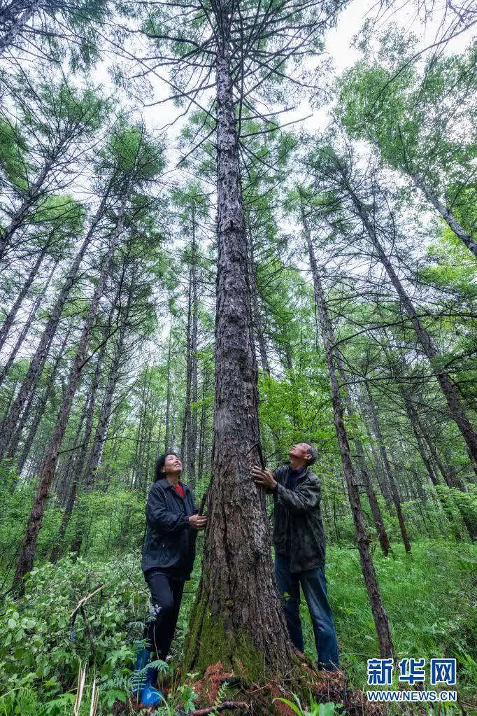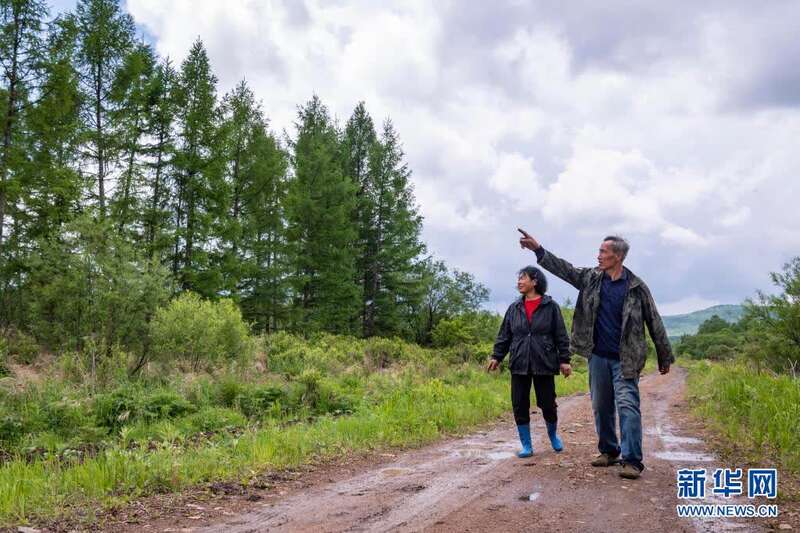 6月3日,在黑龙江省伊春市乌马河林业局有限公司乌马河林场分公司施业区,张英善、燕玉平夫妇看着他们30多年前种下的树。新华社记者 谢剑飞 摄