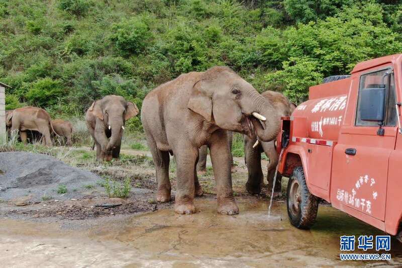 6月3日,消防车在昆明市晋宁区双河彝族乡为野象提供饮水。新华社发