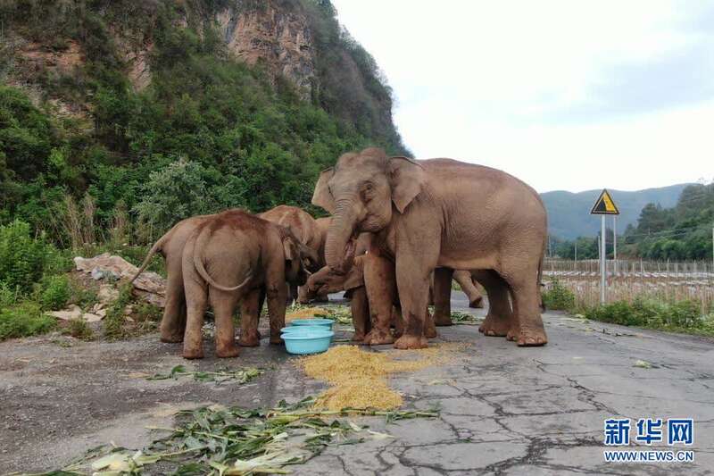 6月3日,野象在昆明市晋宁区双河彝族乡取食工作人员投喂的食物。新华社发