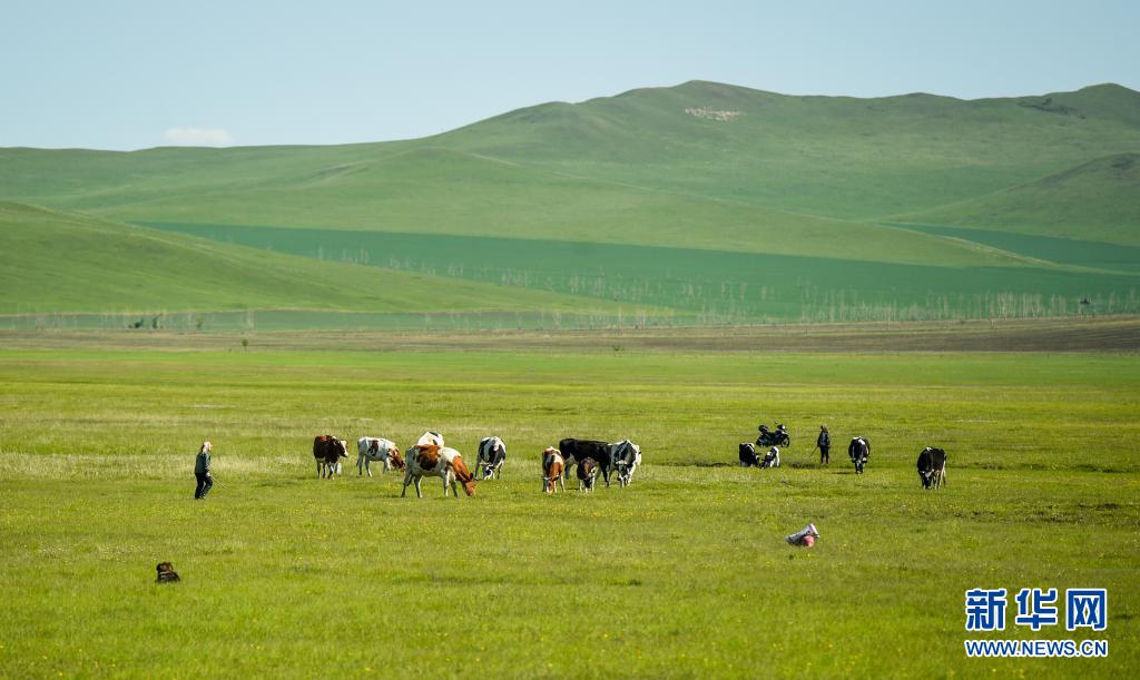 初夏时节,内蒙古呼伦贝尔大草原已披上绿装,牛羊成群如珍珠遍洒。由于今年春季气温高,降水增多,呼伦贝尔草原已全部返青,较往年偏早5至9天。