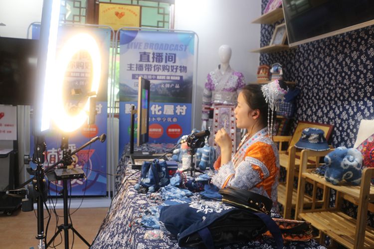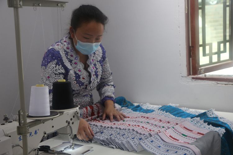 王应在村办民族服装加工车间负责把服饰配件缝合完成,这道工序只是化屋村电商、网络带货直播产业的其中一环,村里还有很多像她一样有孩子不能出远门的女性参与其中。