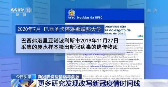 巴西圣卡塔琳娜联邦大学去年7月发表研究报告说,研究小组在弗洛里亚诺波利斯市2019年11月27日采集的废水样本中检测到了新冠病毒的遗传物质。这比巴西报告首例新冠病例的时间提前了约3个月。