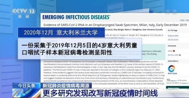 去年12月,米兰大学另一组研究人员在美国《新型传染病杂志》上报告说,一份采集于2019年12月5日的4岁男童口咽拭子样本新冠病毒检测呈阳性。该男童在那之前一段时间没有外出旅行史。