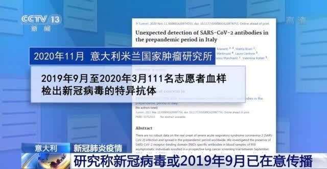 当地时间9日,意大利米兰国家肿瘤研究所对外发布新闻公报称,他们向世卫组织提供了2019年采集的含新冠病毒抗体的血液样本,结果可能将证实他们的推断——新冠病毒在2019年就已经在意大利传播。