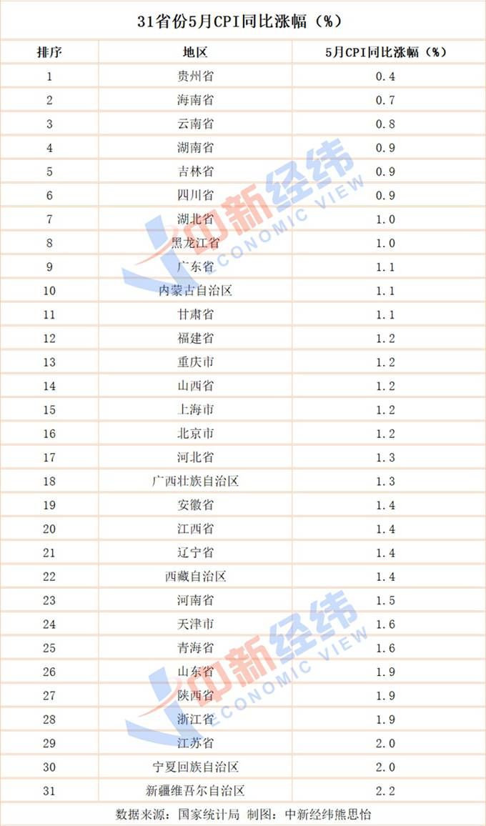 分省份看,贵州、海南、云南、吉林、湖南、四川、黑龙江、湖北、内蒙古、广东、甘肃、北京、山西、上海、福建、重庆16省份5月CPI同比涨幅低于全国平均水平。其中,贵州5月CPI涨幅最低,仅为0.4%。