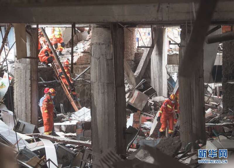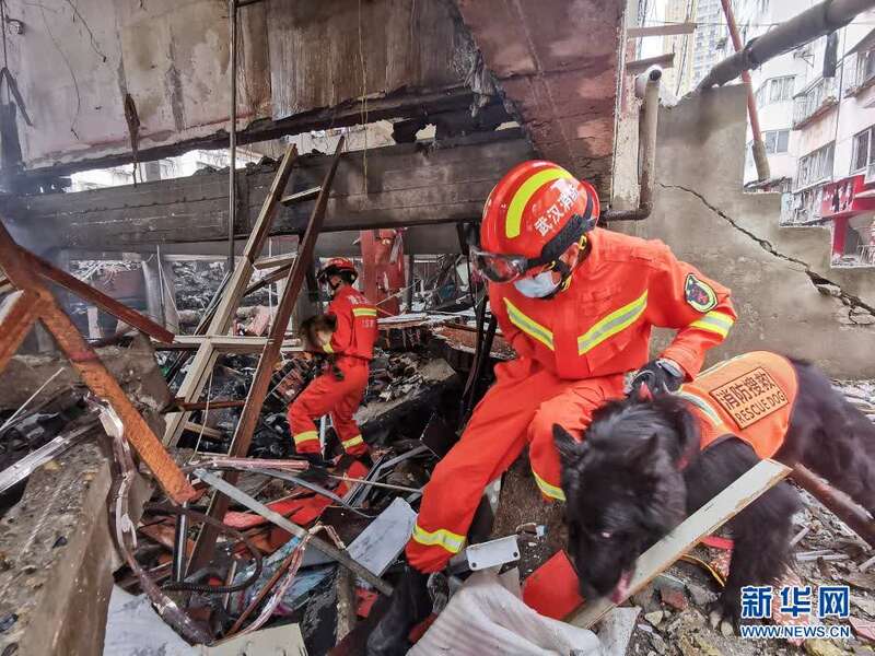 6月13日,消防救援人员和搜救犬在现场搜救。