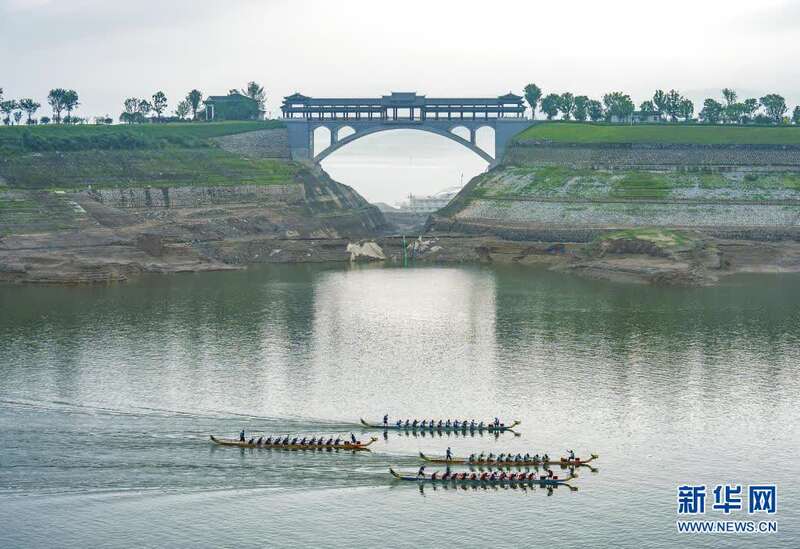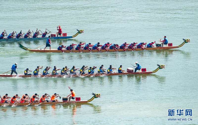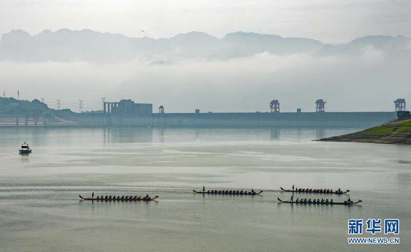 6月14日,参与竞渡的龙舟在比赛中。当日,屈原故里湖北省宜昌市秭归县在三峡大坝前秭归县水域举行龙舟赛,欢庆传统节日端午节。新华社发(王辉富 摄)