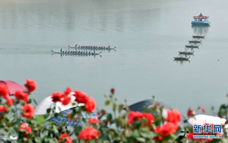6月14日,参与竞渡的龙舟在比赛中。当日,屈原故里湖北省宜昌市秭归县在三峡大坝前秭归县水域举行龙舟赛,欢庆传统节日端午节。新华社发(向红梅 摄)