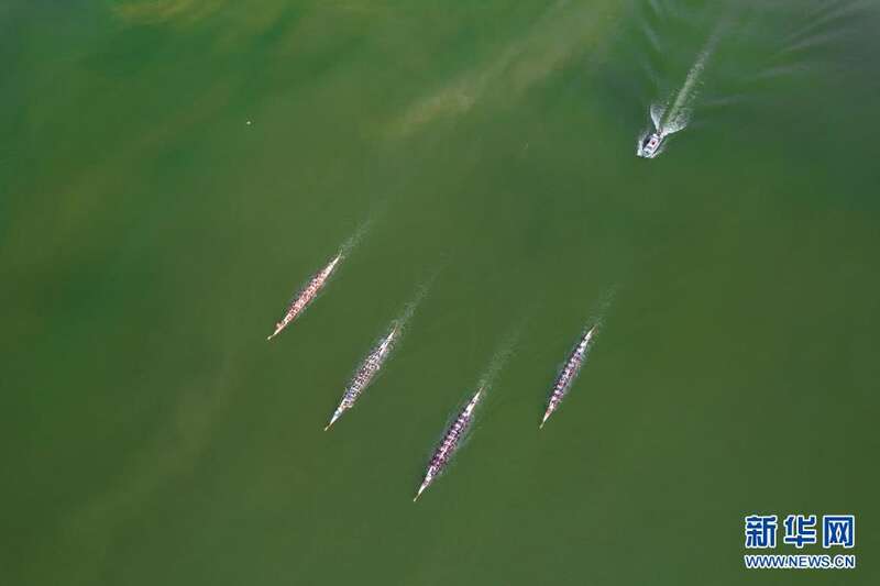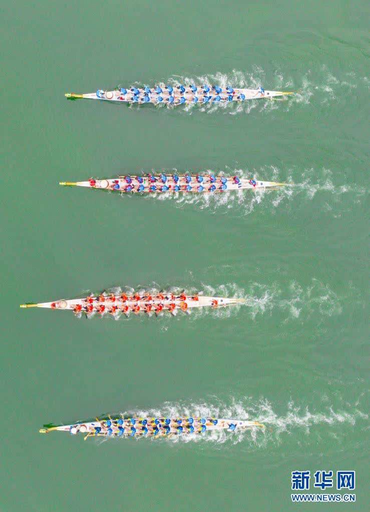 6月14日,参与竞渡的龙舟在比赛中(无人机照片)。当日,屈原故里湖北省宜昌市秭归县在三峡大坝前秭归县水域举行龙舟赛,欢庆传统节日端午节。新华社发(梅雪飞 摄)