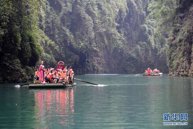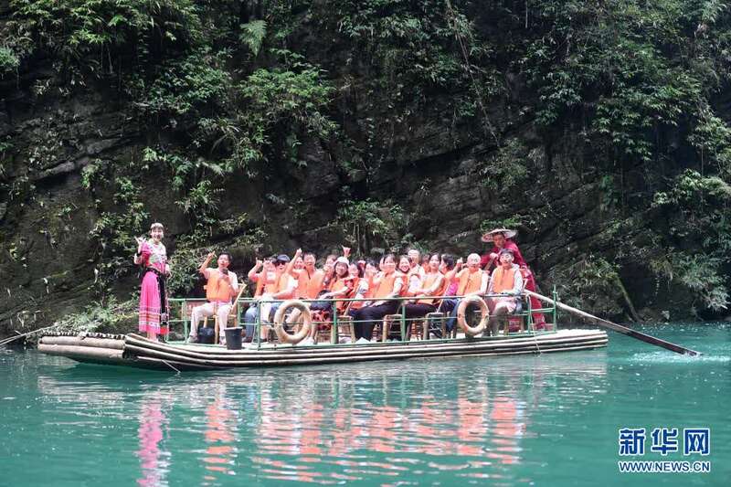 6月8日,游客乘坐竹筏在阿依河景区内游览。