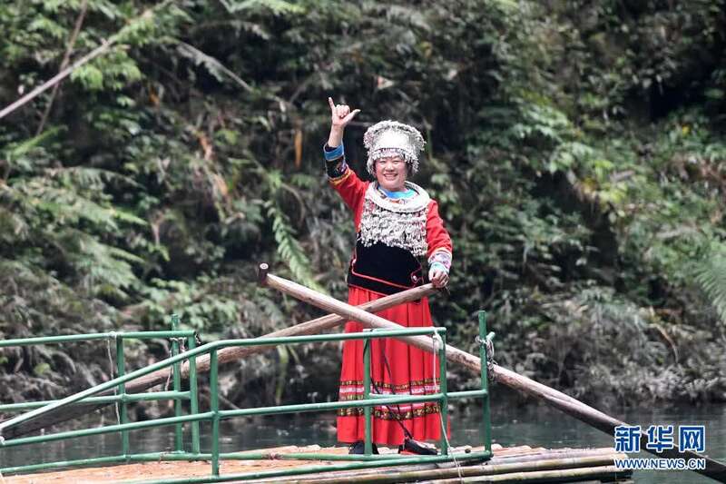 6月8日,阿依河景区内的工作人员在竹筏上唱山歌欢迎游客。