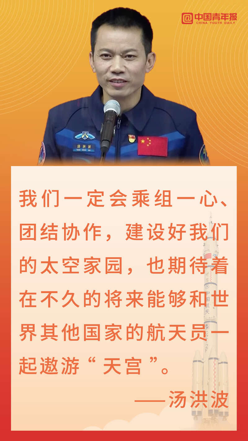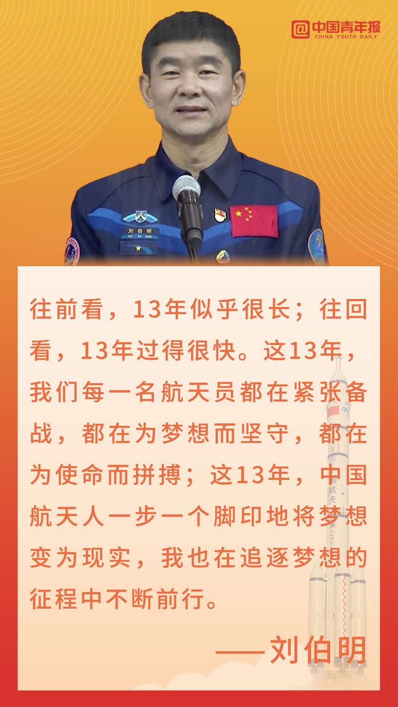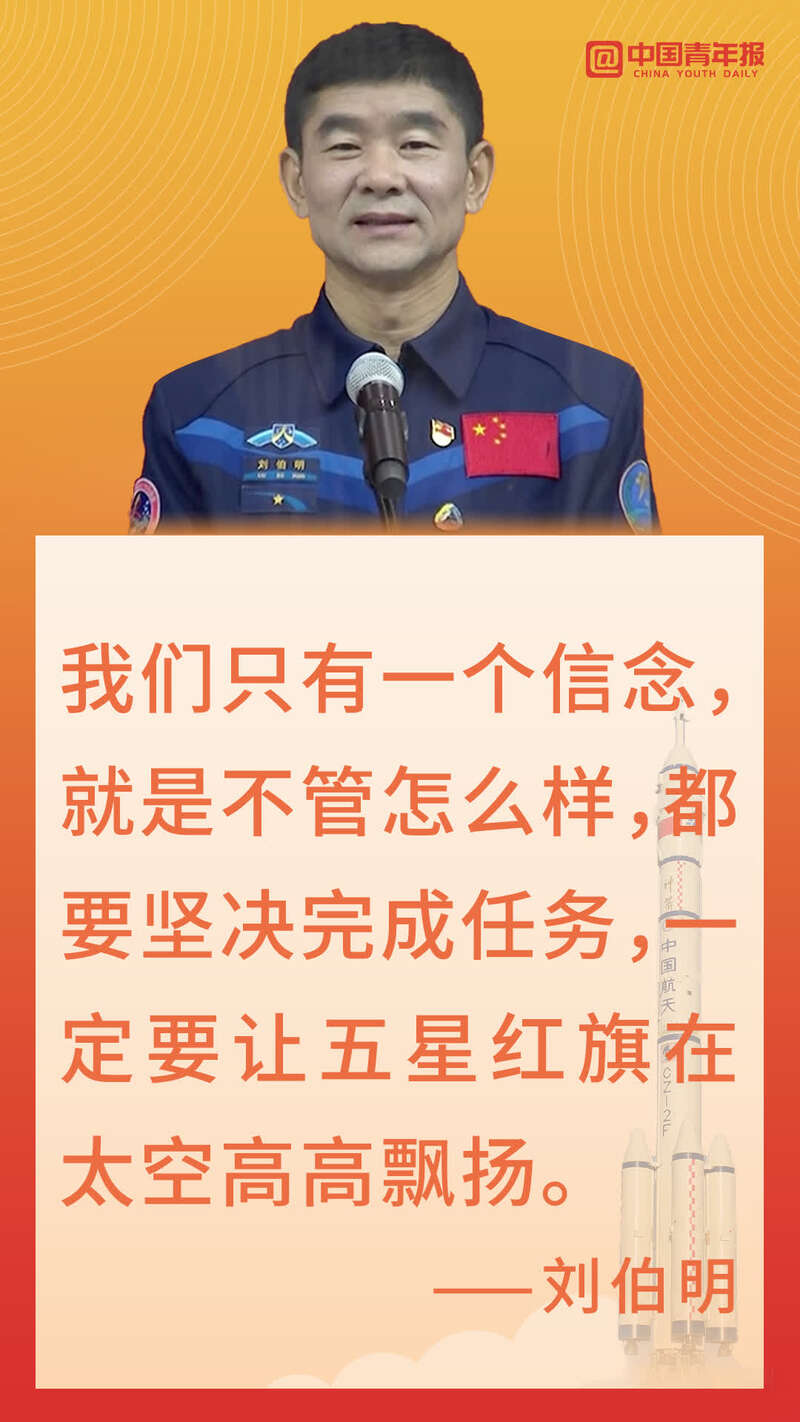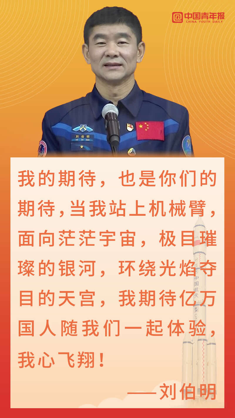 “当我站上机械臂,面向茫茫宇宙,极目璀璨的银河,环绕光焰夺目的天宫,我期待亿万国人随我们一起体验,我心飞翔!”