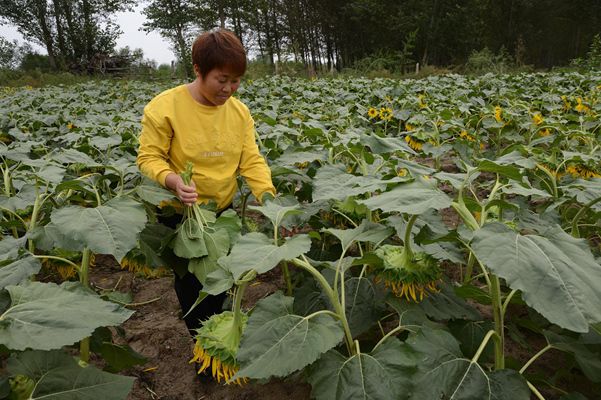 ▲2020年9月14日,内蒙古通辽,科尔沁沙地腹地居民春梅在照看自家的农作物。