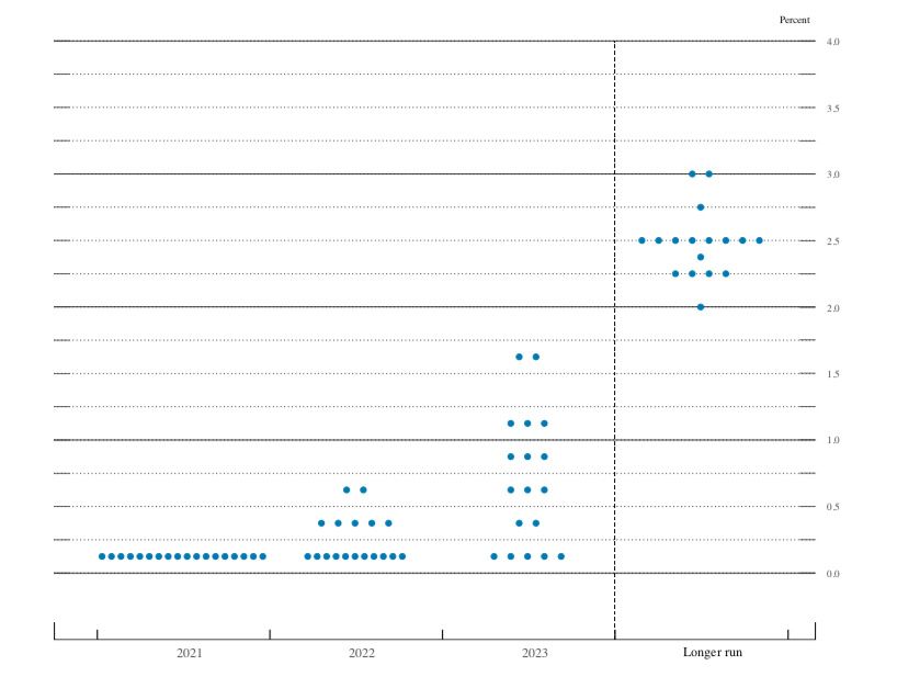 在去年12月的预测中,17名参与预测的官员中,则有16位官员预计将当前利率水平一直持续至2022年,12位官员预计2023年底前不会加息。