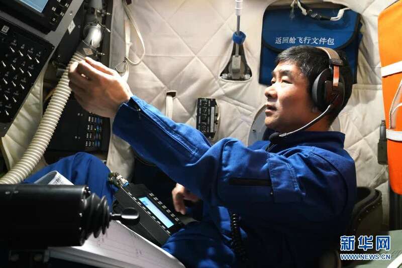 航天员聂海胜、刘伯明和汤洪波在核心舱模拟器内训练(4月22日摄)。