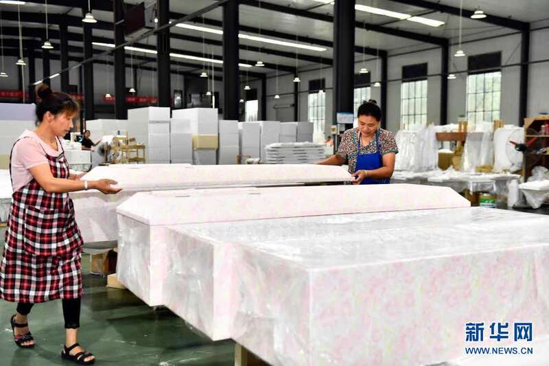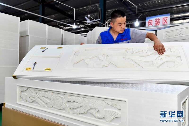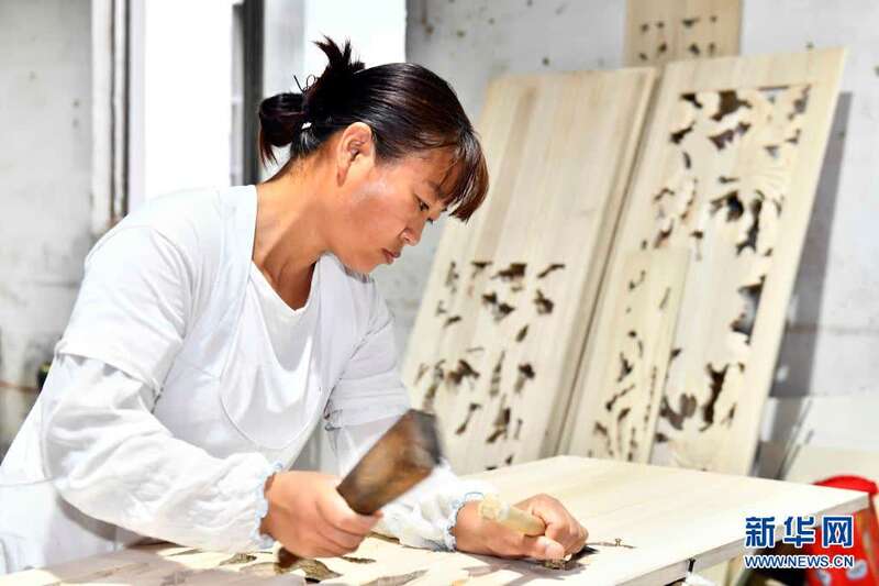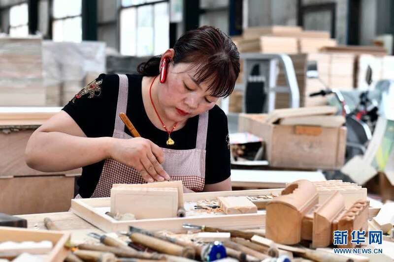 6月17日,在曹县云龙木雕工艺有限公司,工作人员在雕刻木制品。