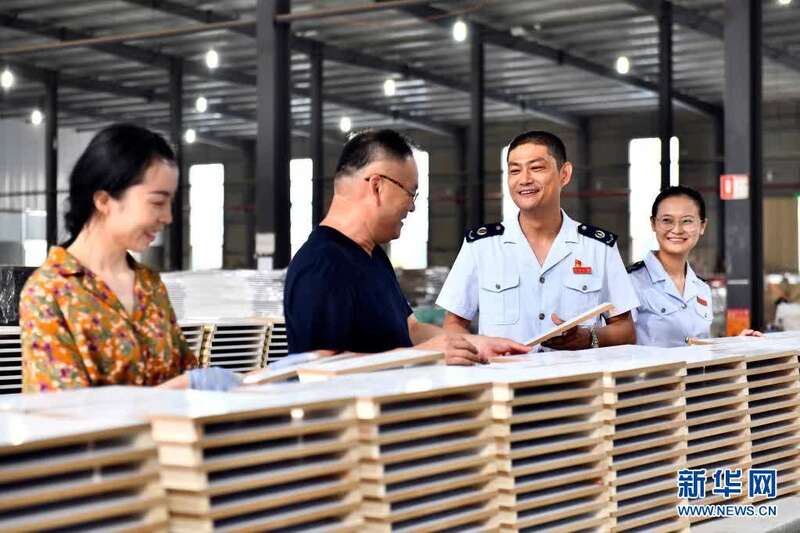 6月16日,在菏泽金然木制品有限公司,曹县税务局的工作人员上门走访,介绍出口退税相关优惠政策。