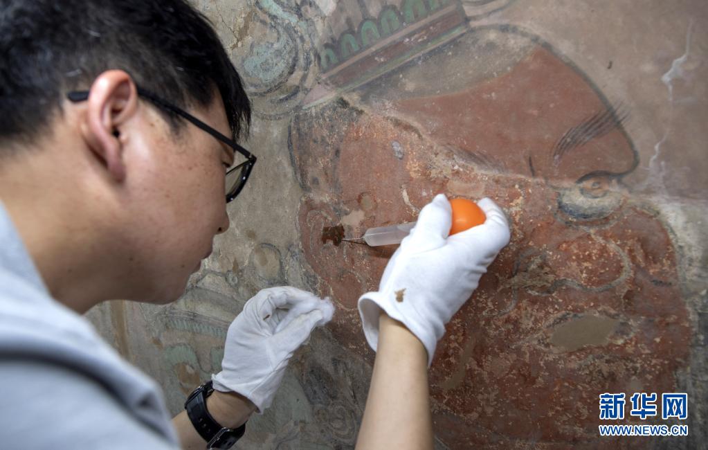 来自敦煌研究院文物保护技术服务中心的文物修复专家在对永乐宫壁画进行修复。