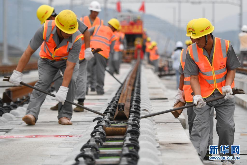 6月22日,中铁十一局的施工人员在杭绍台铁路上进行铺轨作业。