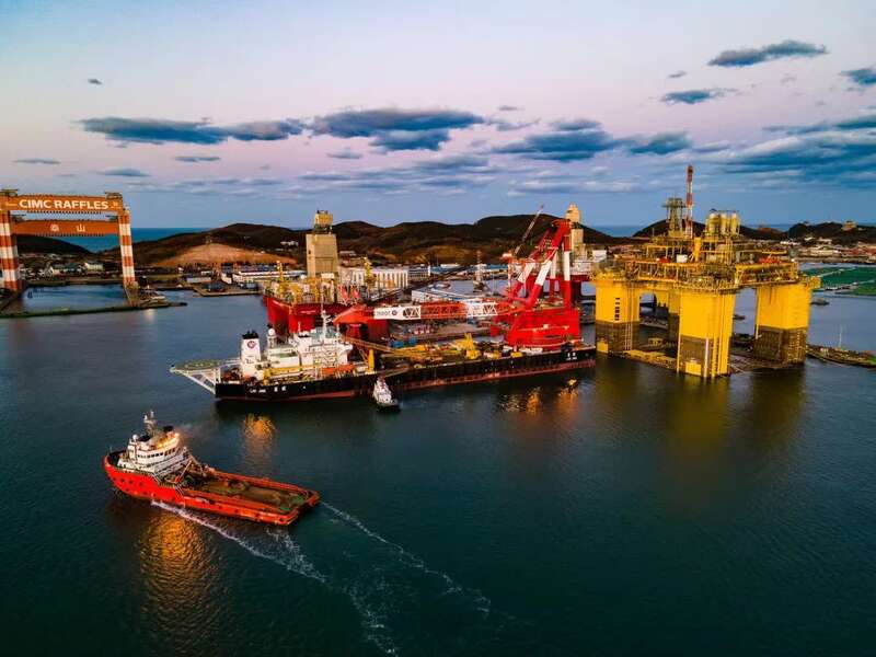 “泰山”吊、“蓝鲸”号起重船、“深海一号”能源站同框。