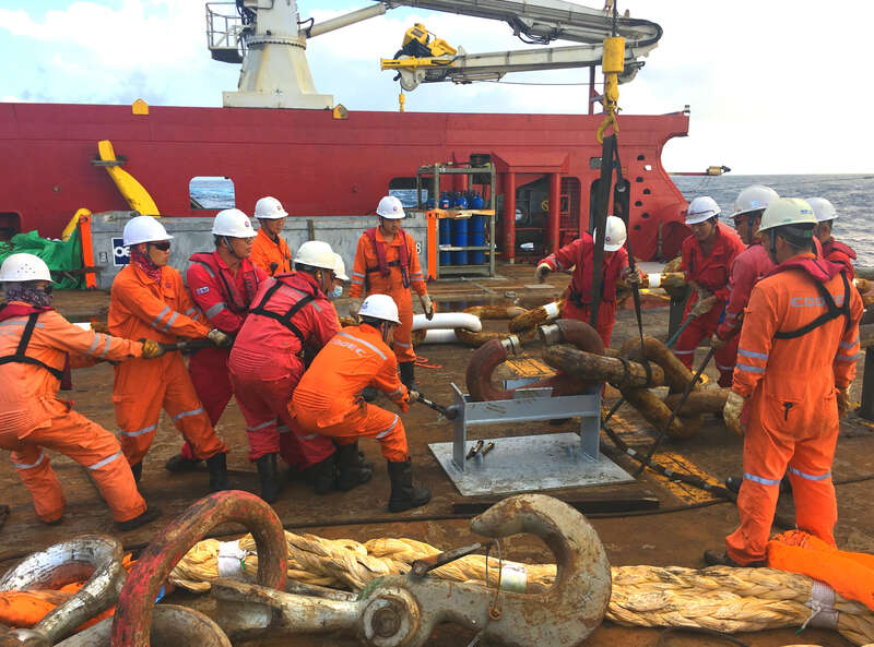 甲板工人连接平台链和牵引链。