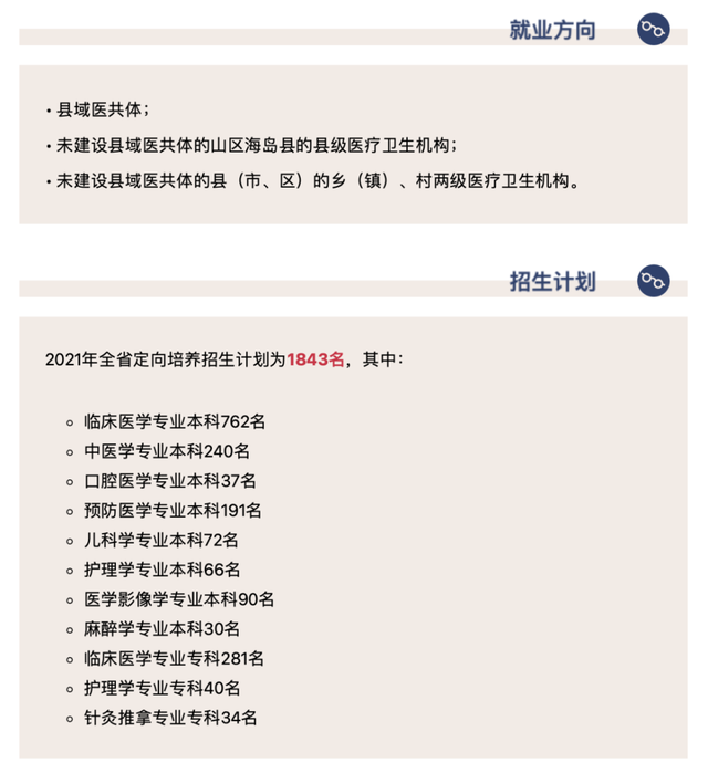 《通知》明确,2021年定向培养本科层次招生专业为临床医学、中医学、口腔医学、预防医学、儿科学、护理学、医学影像学(新增专业)和麻醉学(新增专业);专科层次定向培养招生专业为临床医学、护理学和针灸推拿(新增专业)。
