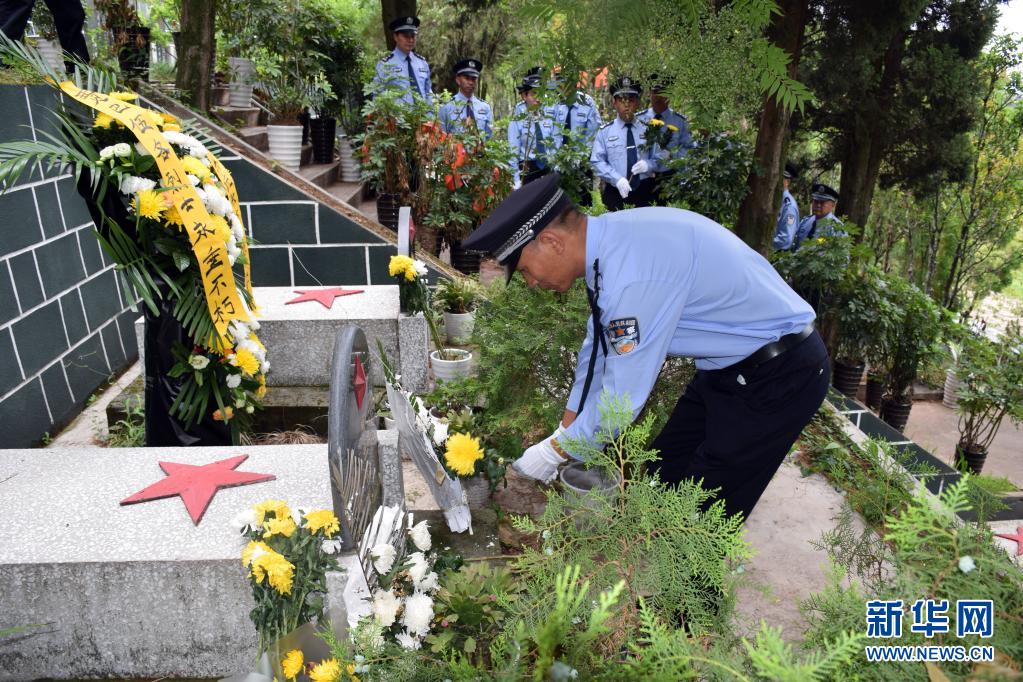 在四川省凉山彝族自治州昭觉县烈士陵园,民警们在布拖县公安局原政工室主任贾巴伍各的墓前献上鲜花(6月23日摄)。
