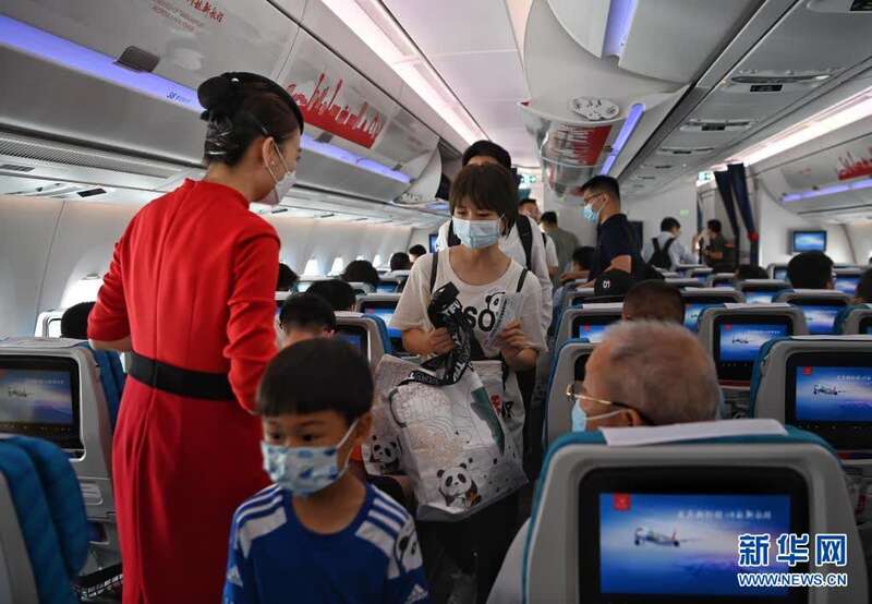 6月27日,在成都天府国际机场,搭乘四川航空公司3U8001航班的旅客陆续登机,这是该机场投入使用后首个航班。新华社记者 王曦 摄