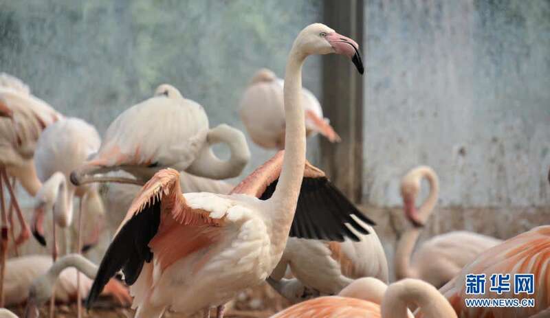 北京动物园内的火烈鸟在室内乘凉(6月28日摄)。新华社记者 李欣 摄