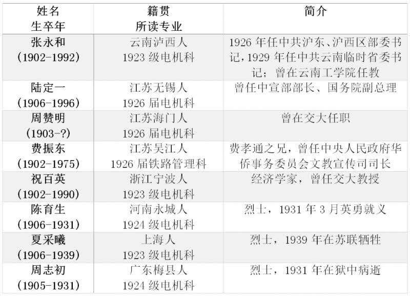 这是一段令所有交大人为之骄傲自豪的光荣历史。8位优秀的交大早期共产党员在革命熔炉淬炼中,选择了为党和国家的事业奋斗终生,其中陈育生、夏采曦、周志初3位同志英勇牺牲,成为革命烈士。交大党团组织在艰苦的革命斗争中发展壮大,在险恶的环境条件下表现出坚定的共产主义信念和强烈的爱国主义精神,永远值得我们学习。